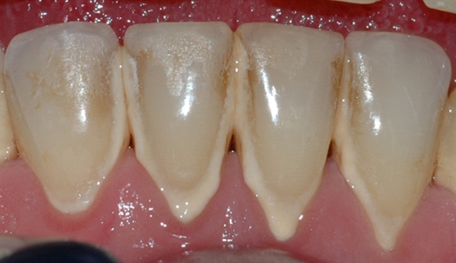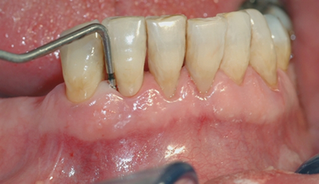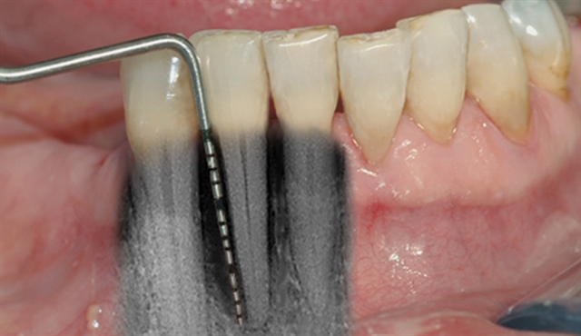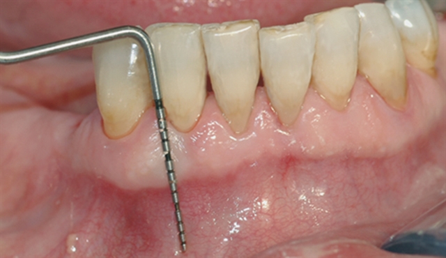 Instrumentet er her lagt utanpå tannkjøtet for å vise kor omfattande festetapet er.