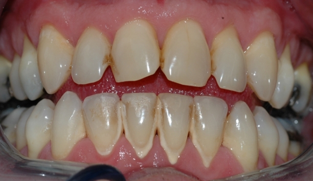 Biletet viser eit tannsett med synleg tannstein og misfarging.